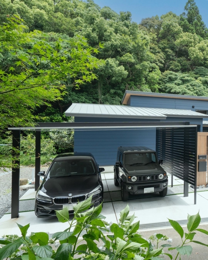 そこで風向きに応じたスクリーンを取付け、見た目の美しさだけでなく、暮らしのリズムに寄り添うような駐車スペースに仕上げました*