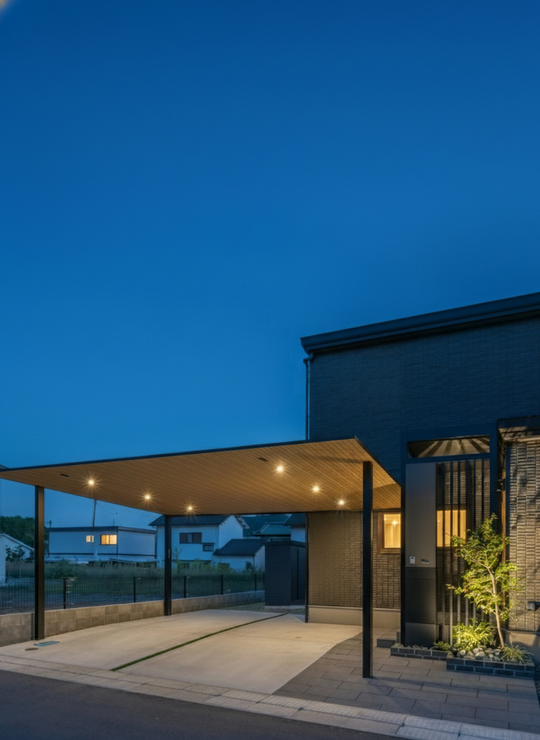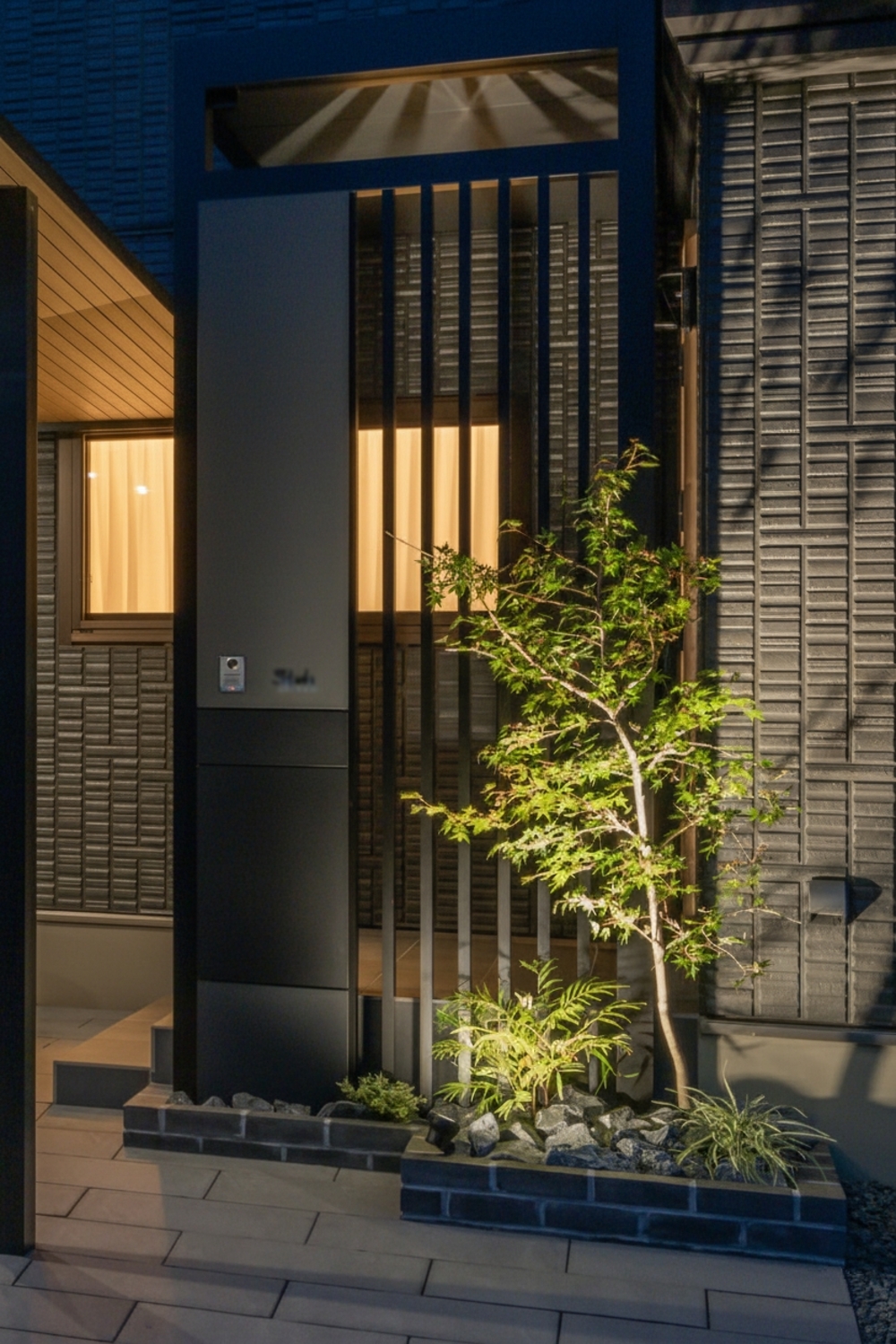 さらに、縦格子とアップライトを組み合わせることで、昼はプライバシーを守りつつ、夜は安心感と高級感を演出。