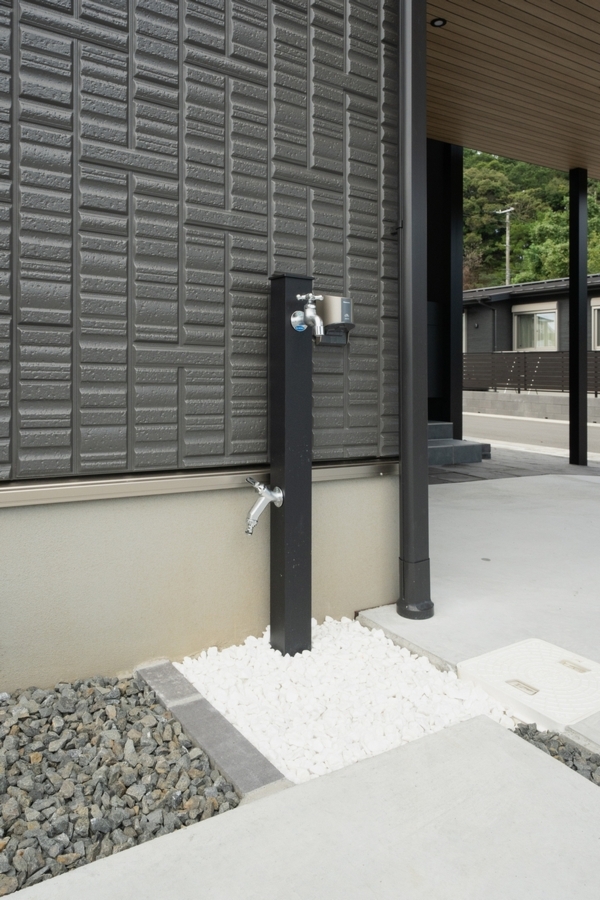 また、大型の物置はモノトーン調の外観に合わせた“見せる物置”として設置。
