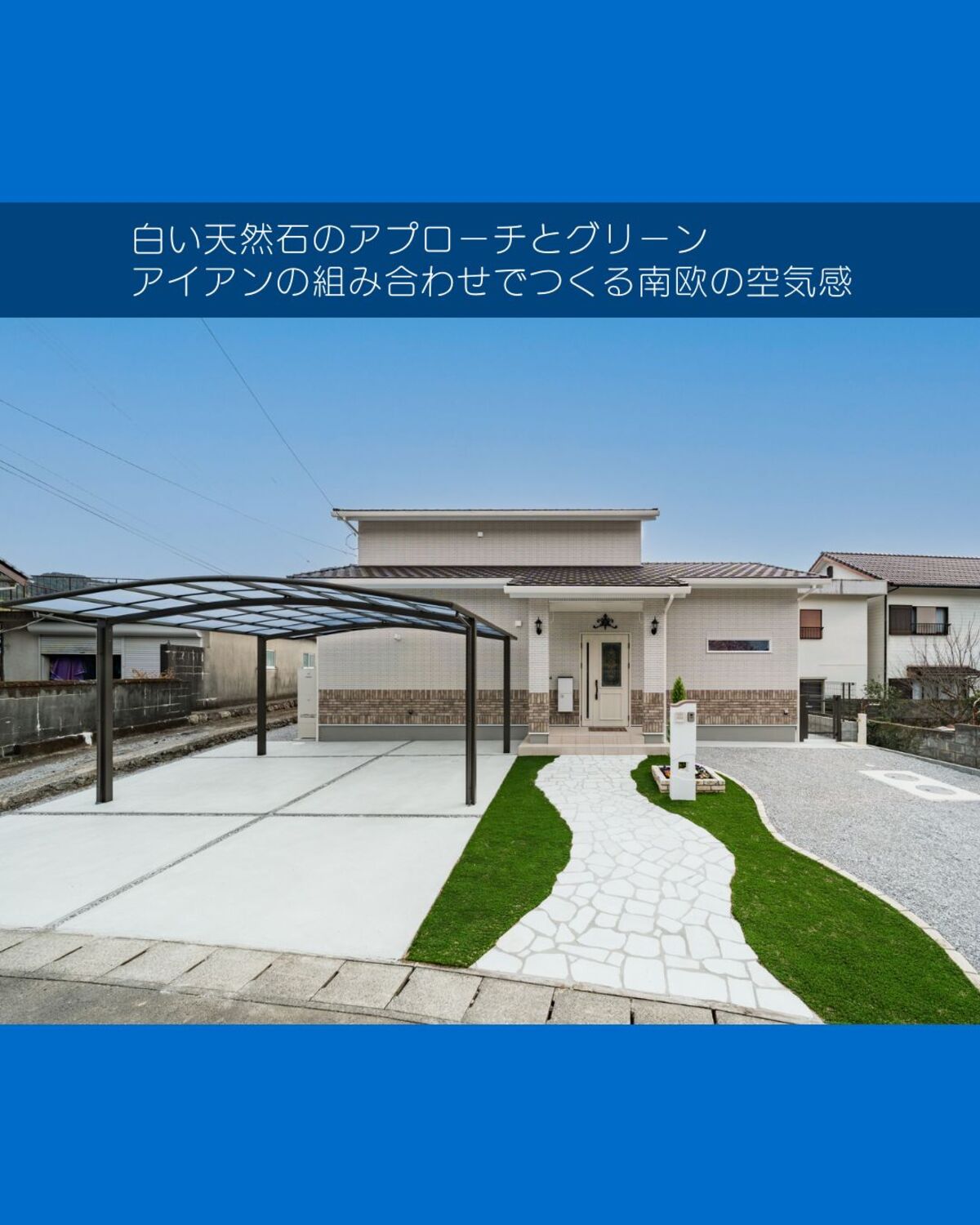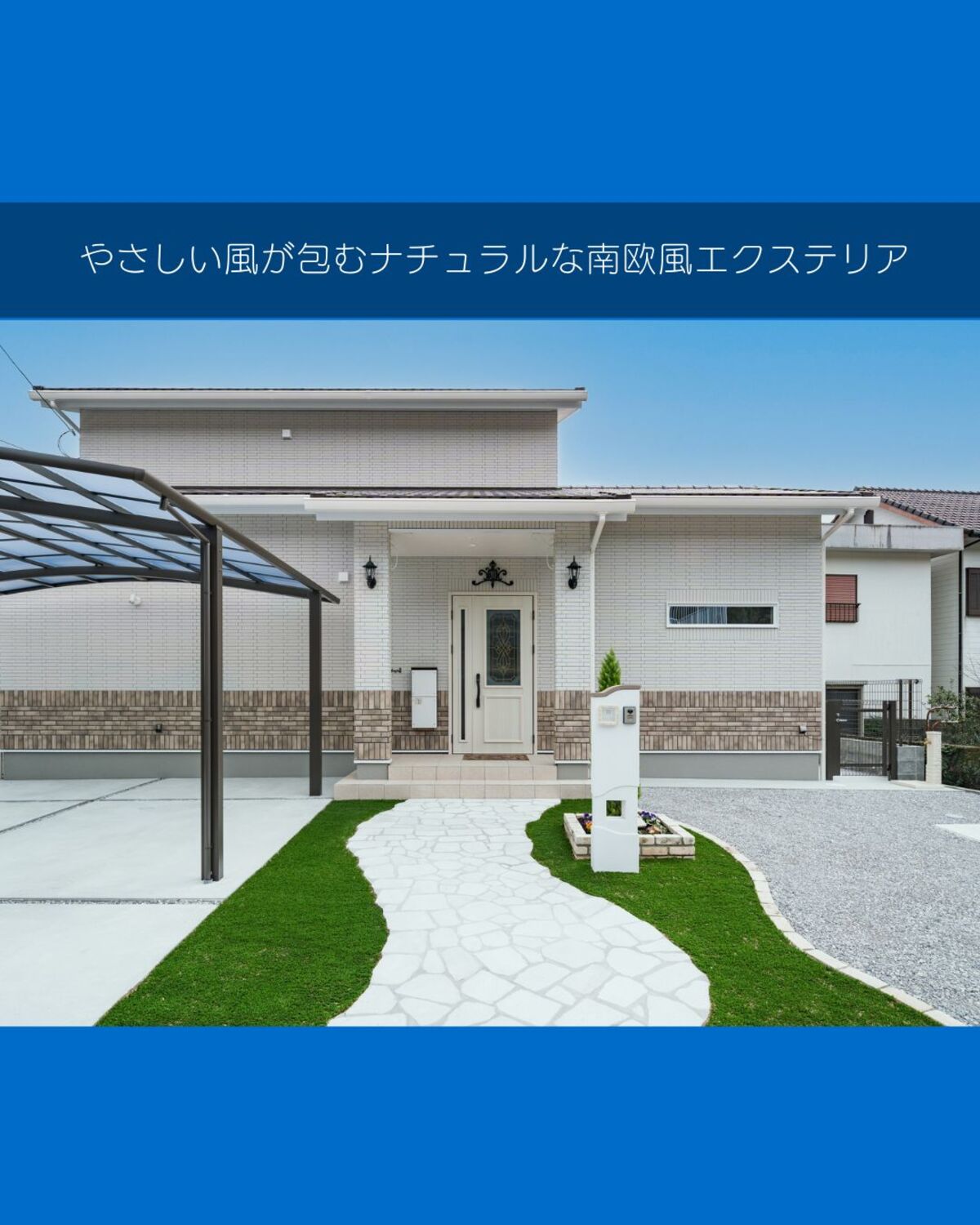 南欧風外構や白を基調としたエクステリア、天然石アプローチ・人工芝を取り入れたデザインをご検討中の方におすすめの施工例です。