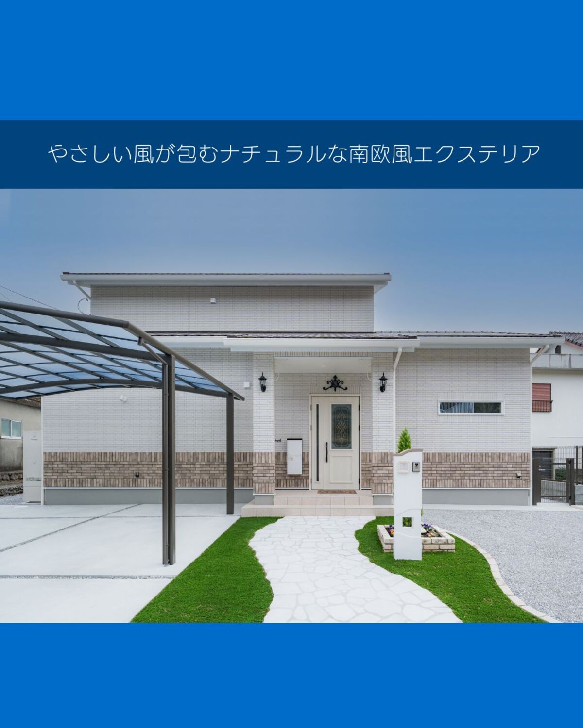 南欧風外構や白を基調としたエクステリア、天然石アプローチ・人工芝を取り入れたデザインをご検討中の方におすすめの施工例です。