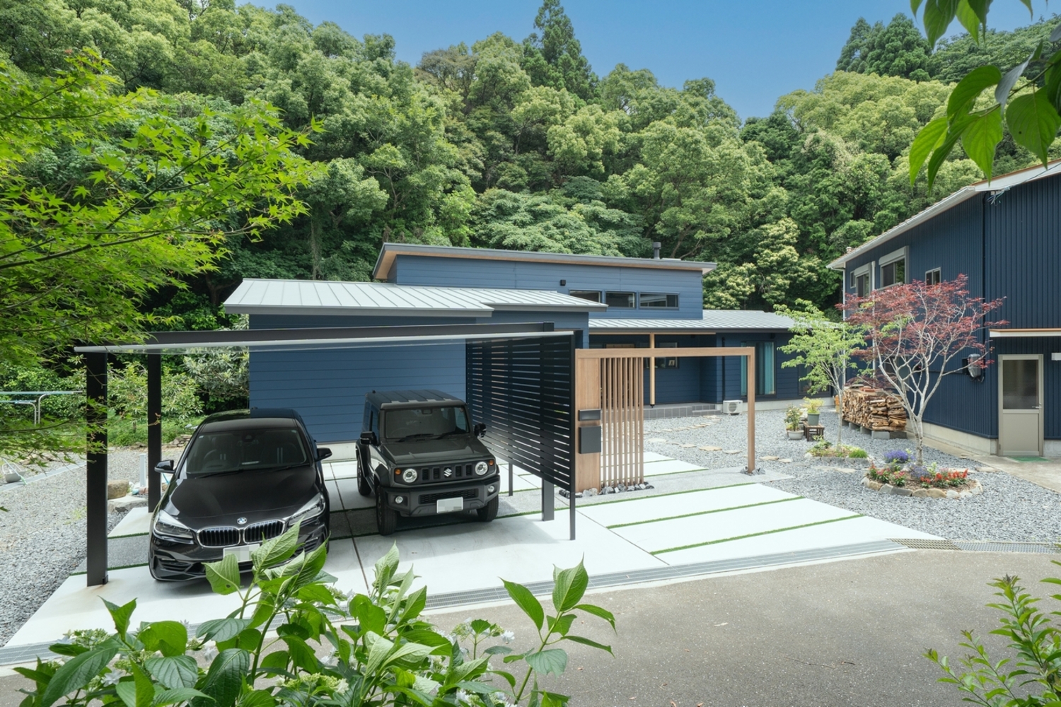 直線的でスタイリッシュなデザインが、和モダン建築の外観と美しく調和します。